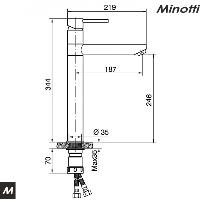 Proizvođač MINOTTI nudi model iz serije TUBO — model 6119 — kao jednoručnu bateriju za lavabo visoke konstrukcije, namenjenu pre svega za nadgradne lavaboe („high rise“ tip).