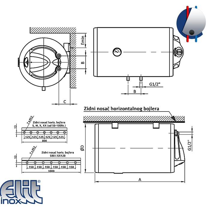 • Navedeni horizontalni bojler, omogućava fleksibilnu montažu – može se postaviti na zid, ispod plafona ili skoro horizontalno u prostorima sa visinskim ograničenjima.