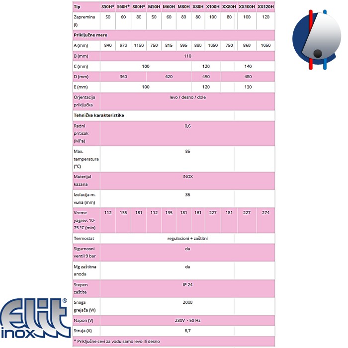 Model XX100H iz serije Talas H proizvođača ELIT INOX predstavlja bojler 100l dizajniran za horizontalnu montažu.