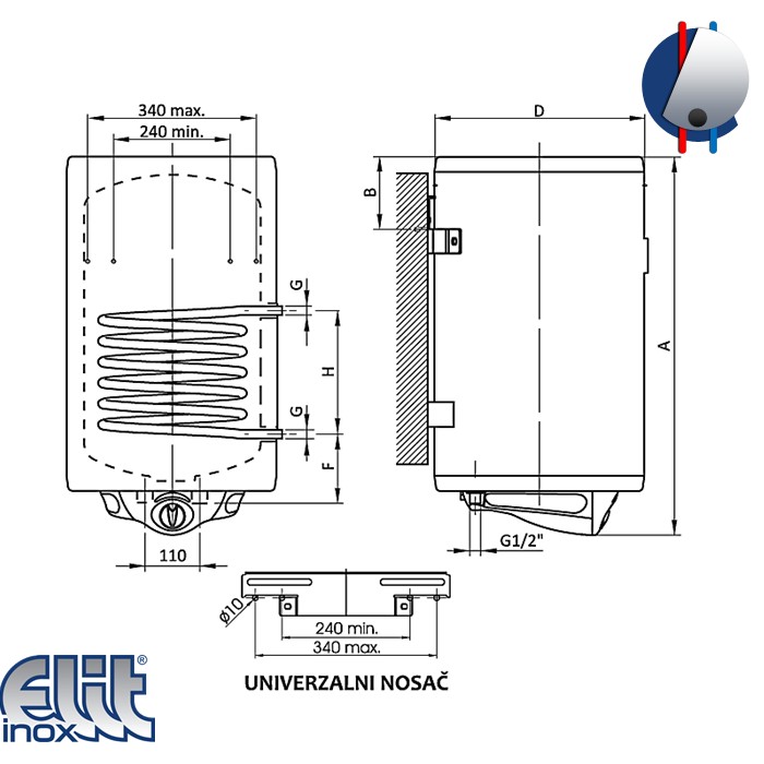 - Tip: kombinovani bojler – poseduje izmenjivač toplote (spiralu) koja omogućava grejanje vode preko sistema grejanja, uz električni grejač