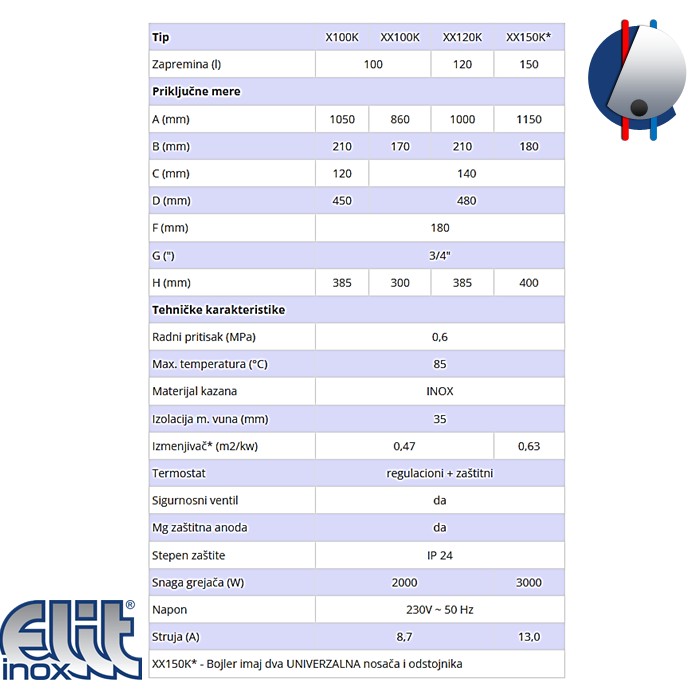 Model Talas XX120K iz serije TALAS K kompanije ELIT INOX je kapacitetni bojler 120l projektovan kao kombinovani bojler.