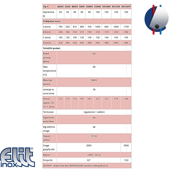 Model Talas XX150V iz linije ELIT INOX predstavlja snažan i robusan bojler 150l, predviđen za primenu kao kupatilski bojler u većim domaćinstvima i objektima sa većim potrebama za toplom vodom.