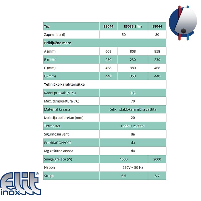 Model Talas E5035 SLIM iz serije Talas E – SLIM kompanije ELIT INOX predstavlja visokokvalitetan bojler 50l, dizajniran kao uska verzija za prostore sa ograničenim mestom.