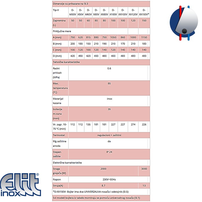 Model Talas D-XX80V iz linije Talas D kompanije ELIT INOX predstavlja savremen bojler 80l sa vertikalnom montažom. Kao vertikalni bojler, idealan je za zidnu instalaciju u kupatilima ili tehničkim prostorijama. ELIT INOX Talas D-XX80V kombinuje inox konstrukciju, elektronski termostat i niz zaštitnih funkcija — sve to dok održava kompaktan dizajn za srednje potrebe tople vode.