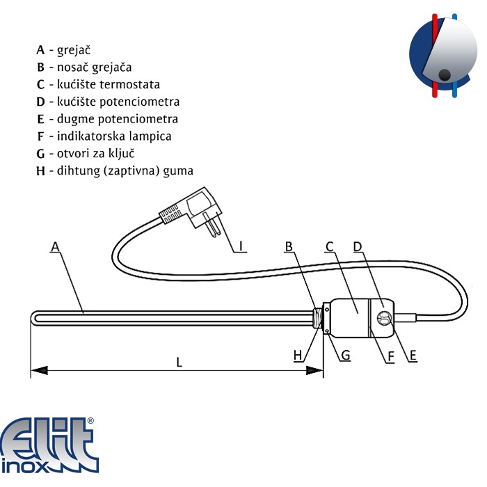 - Konstrukcija: štapni grejač sa mehaničkim/spiralnim priključkom, sa elektronskim termostatom (regulacija 10-65 °C) i signalisanjem lampicom.