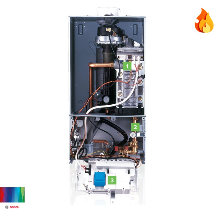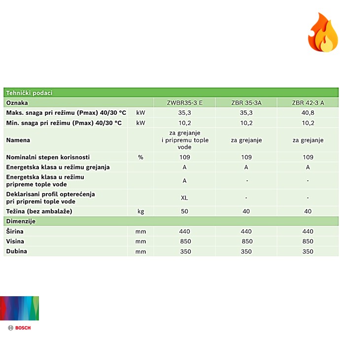 - Regulacija: Bosch Heatronic III elektronika, modulacija snage, kontinuirana regulacija plamena.