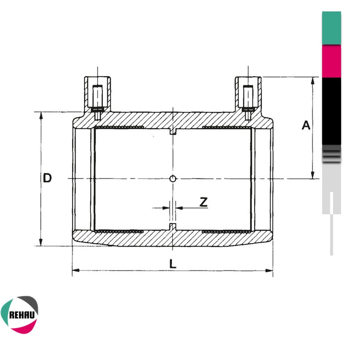 Spojnica 75 ESM elektrofuzioni muf SMARTFUSE REHAU je specijalni fiting dizajniran za elektro-fuziono povezivanje cevi dimenzije 75 mm u sistemu RAUTITAN i RAUPEX.