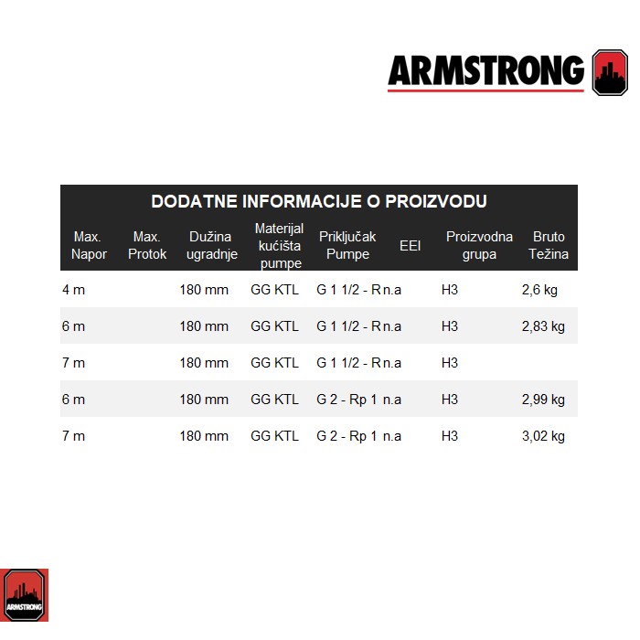 ARMSTRONG cirkulacione pumpe sa 3 brzine, sa odzračnim zavrtnjem, energetski optimizovane sa funkcijom ručnog pokretanja, 230 V / 50 Hz, klasa zaštite IP 44, klasa izolacije H, temperaturna klasa TF 110 (temperatura fluida +2 do + 110 °C), nominalni pritisak PN10 (maks. pritisak sistema 10 bar), kućište pumpe od livenog gvožđa sa kataforeznim premazom, pojedinačno pakovanje uklj. uputstvo za upotrebu.